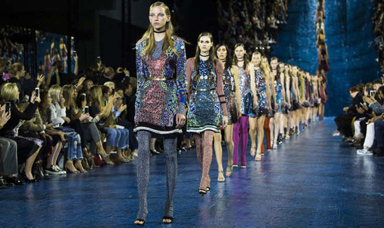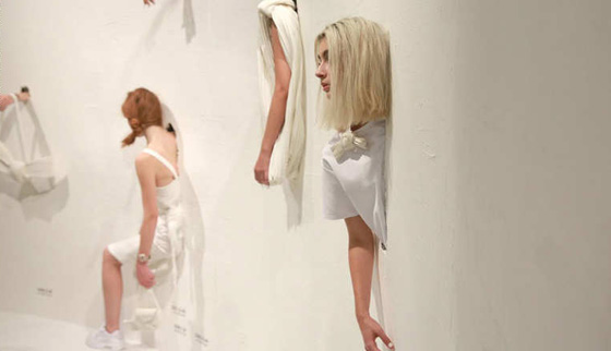 في عرض فوستين ستينميتز، المشهورة بقطعها المصنوعة يدوياً من قماش الدنيم، تخرج عارضات الأزياء من جدار مصنوع من الجص، وهنّ يرتدين ملابس مستوحاة من الفنان سلفادور دالي.