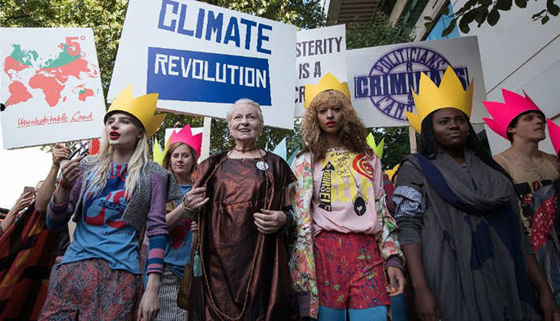 قامت المصممة البريطانية فيفيان ويستوود بتظاهرة ضد التغيير المناخي وإجراءات التقشف، حين سارت مع مجموعة من المتظاهرين من عارضي الأزياء في الشوارع، قبل اعتلاء منصة عرض الأزياء.