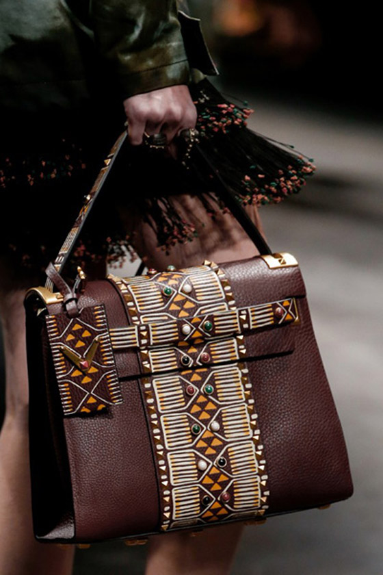 في الصورة شنطة Tote بنية اللون مزدانة بنقشات أفريقية مميزة من توقيع فالنتينو Valentino.