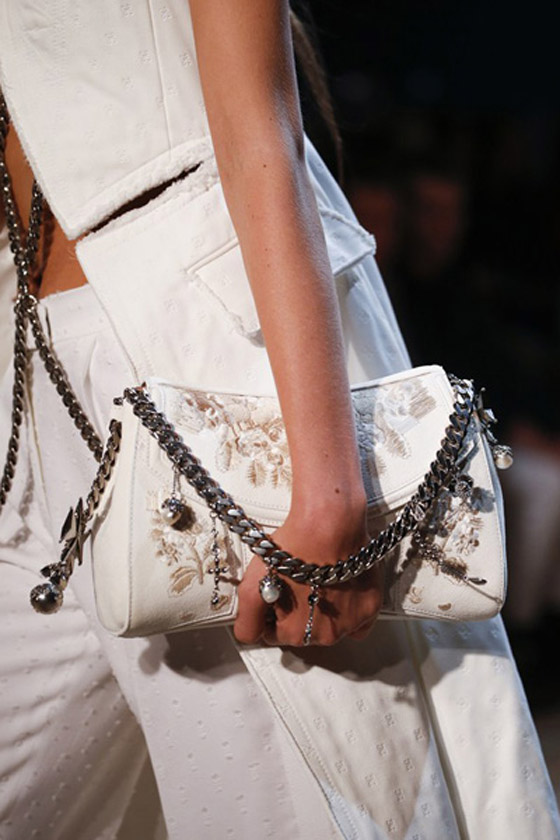 شنطة كتف بيضاء مزينة بالنقشات البيج والسلسلة الفضية من توقيع ألكسندر ماكوين Alexander McQueen.