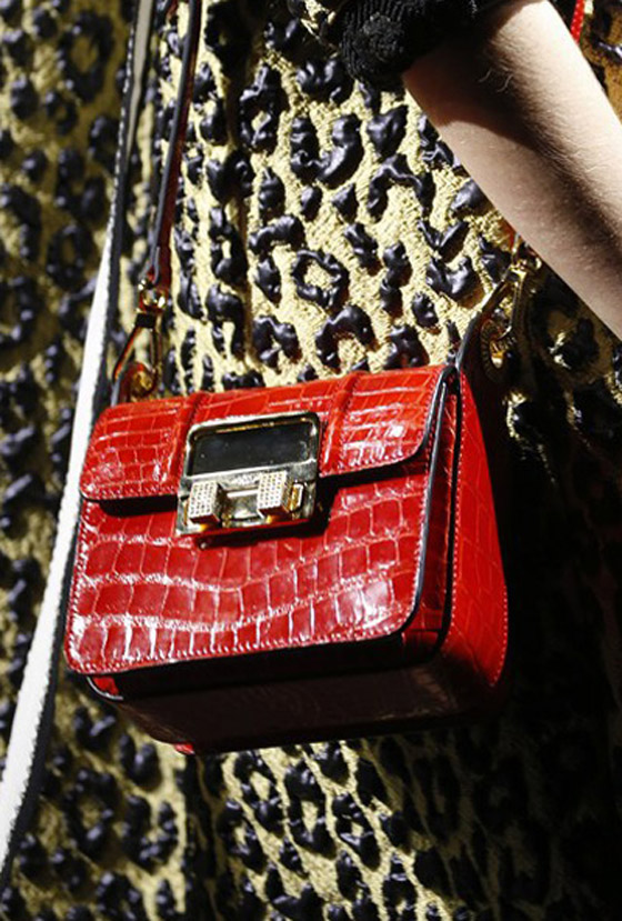 شنطة مميزة بتصميمها الأقرب إلى شكل المربع ونقشات الحيوانات التي تزيتها من توقيع جيامباتيستا فالي Giambattista Valli.