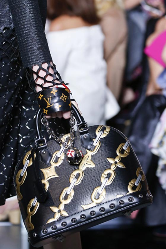 في الصورة شنطة سوداء فاخرة مزينة بنقشات على شكل السلاسل الذهبية من توقيع لويس فيتون Louis Vuitton.