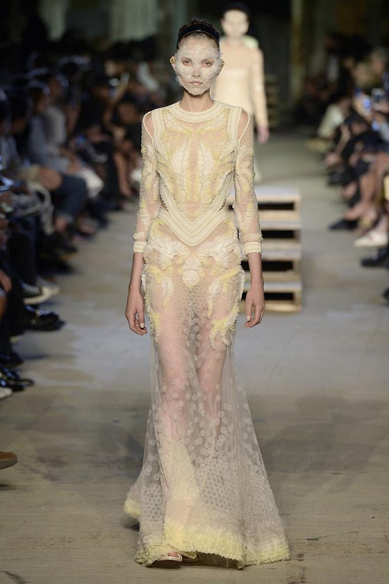 جيفانشي: فستان زفاف مع قناع للوجه من الدانتيل والمجوهرات يكمل اطلالة فستان زفاف شفاف فيه رومانسية وغموض.