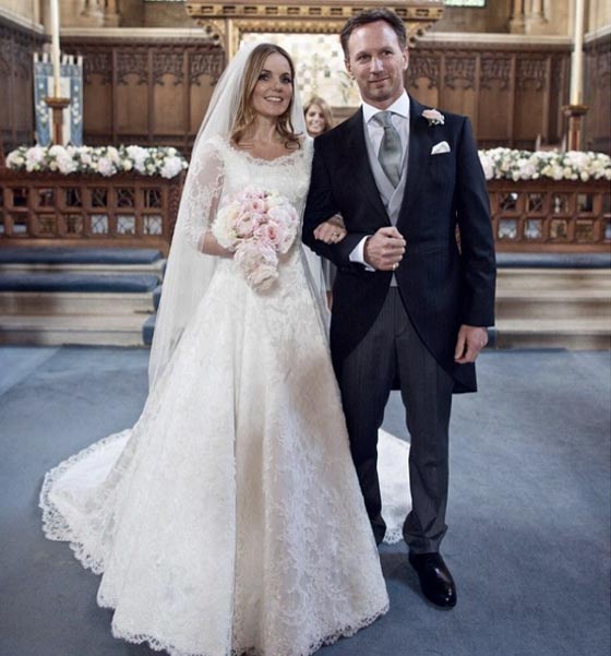 جيري هالويل وهي "سبايس غريل" سابقا اختارت فستان زفاف انيق من تصميم سارة بارتون من الكسندر ماكويين.