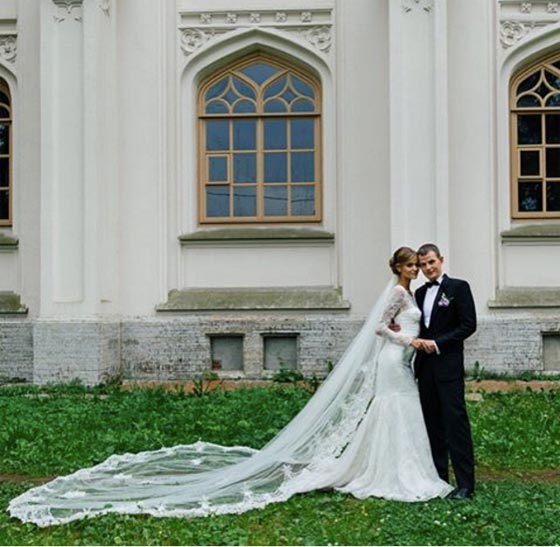 كيت جريجوريفا عارضة الأزياء الروسية التي تعمل لدى فيكتوريا سيكريت ارتدت فستان من الدانتيل من تصميم زاك بوزين لشركة الأزياء "عرائس ديفيد / ديفيد برايدال"..