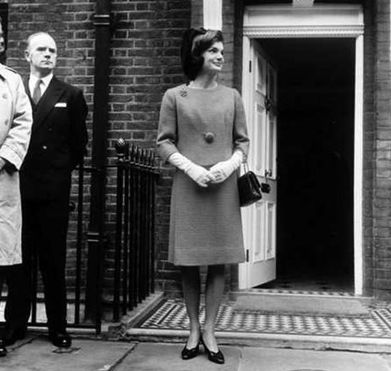 جاكي في بريطانيا خلال زيارة للملكة إليزابيث الثانية، مرتدية زيا من تصميم شانيل.