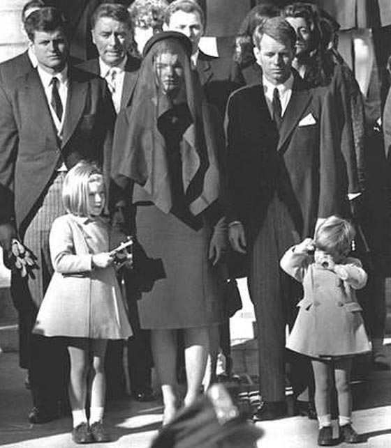 جاكي في مراسم جنازة زوجها مع ولديها وشقيقي زوجها.