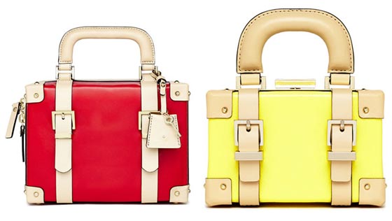 أما هذه الحقائب فهي بوحي من الصندوق، وتلك الفكرة سبق وقدمتها علامة لويس فيتون بتصاميم مميزة، وإختارت علامة كيت سبيد اللونين الأحمر والأصفر مع البيج لهذا التصميم.