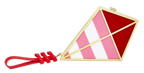 حقيبة عصرية بوحي من الطائرة الورقية، بألوان الأحمر، الوردي، والذهبي، مع الفيونكات الحمراء التي تتدلى منها.