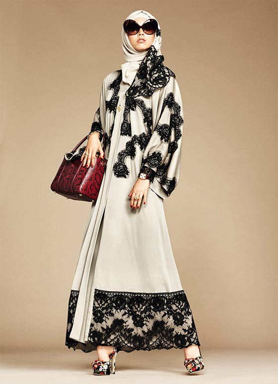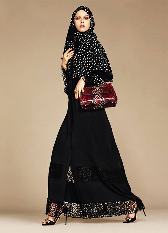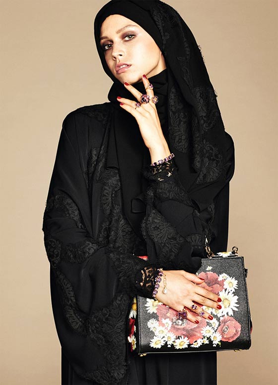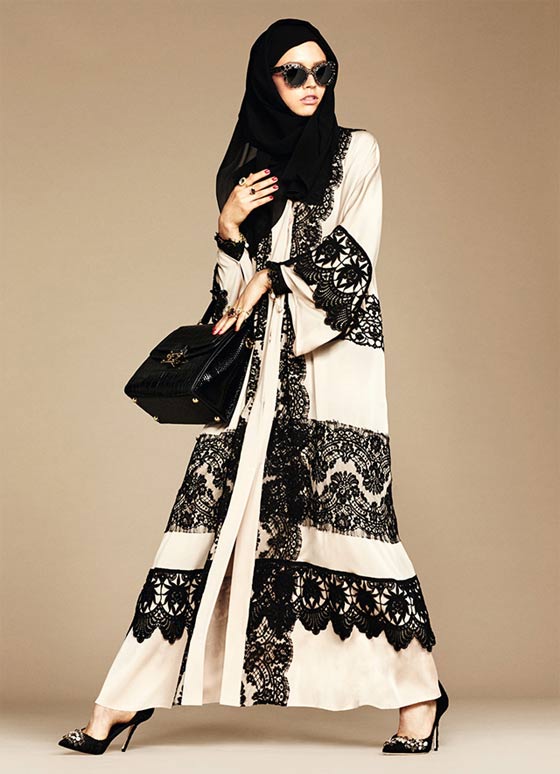 اختارت دار "دولتشي اند غابانا" في بداية هذا العام أن تحاكي النساء العربيات وتحديداً المرأة المحجبة من خلال مجموعة من العبايات التي أطلقتها، وينتظر أن تلقى رواجاً كبيراً في صفوف النساء اللواتي يحلمن بالجمع بين الأناقة المحتشمة والإطلالات الراقية. العباءة السوداء كانت الحاضر الأكبر في هذه المجموعة، وهي تزينت بالدانتيل حيناً، وبقصات اللايزر Laser Cut حيناً آخر، بالإضافة إلى تطريزات الورود، طبعات الأزهار البيضاء ورسمات فاكهة الليمون التي سبق أن زينت العديد من تصاميم دار Dolce&Gabbana في مجموعاتها السابقة.حضور الدانتيل بكثافة أضفى لمسات أنثوية راقية على هذه الإطلالات التي ترافقت مع شيلة تناسقت بامتياز مع لون كل عباءة وخامتها.