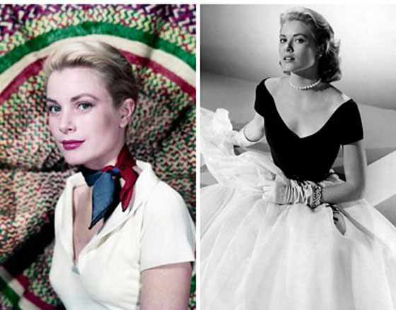 الممثلة الأمريكية الجميلة "غريس كيلي" التي أصبحت أميرة موناكو بعد زواجها من الأمير Rainier والتي تميزت بالوشاح الحريري المعقود بشكل أنيق ومختلف، وكذلك لبس عقود من اللؤلؤ الأبيض بشكل كلاسيكي رائع.