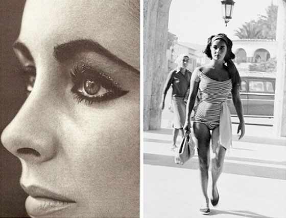ملكة الأناقة والموضة "اليزابيث تايلور" برسمة العيون "القطة" الموجودة في خطوط الموضة حتى الآن والتي اشتهرت بها باستخدام الكحل السائل وبمناسبة دخول الصيف فالمايوه المخطط الذي ارتدته في طريقها إلى الشاطئ عام 1959 ما زال يقلده العديد من النساء حتى الآن.