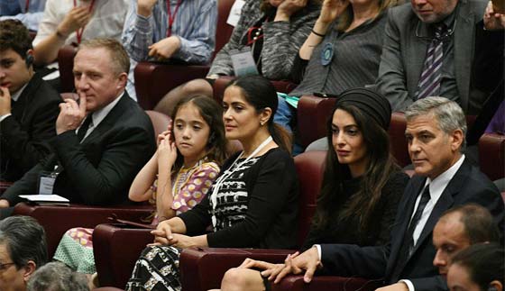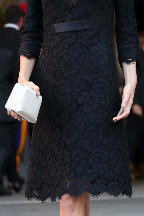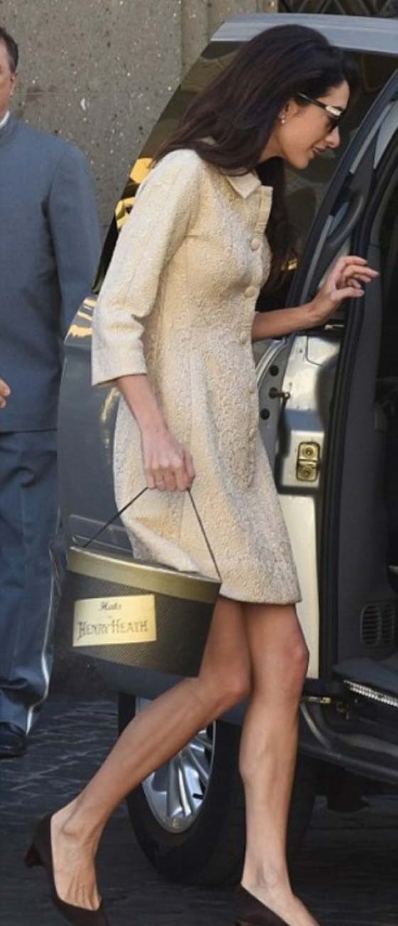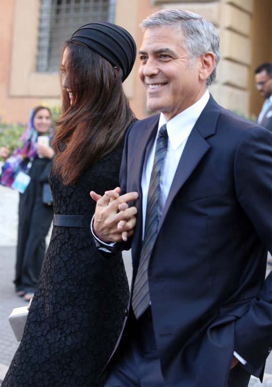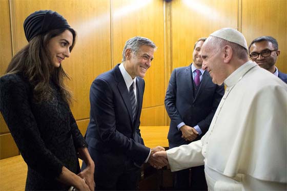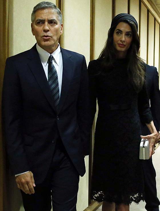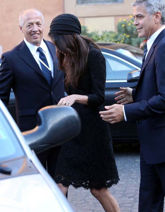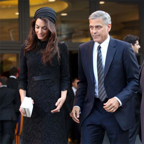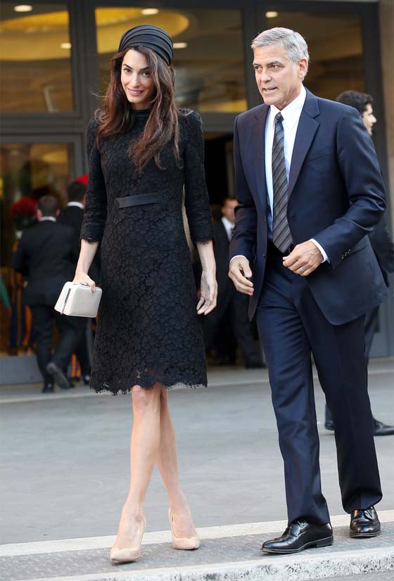 وقد رصدت المجلات العالمية الإطلالة الأنيقة التى اختارتها المحامية الجميلة امل كلونى لمقابلة بابا الفاتيكان وارتدت فستان أسود تحت الركبة وبأكمام طويلة من فييرساتشى. واختارت امل كلوني فى جميع إطلالاتها فى روما هذه المرة أزياء وقورة انيقة للغاية بأكمام طويلة وتصميم بسيط.