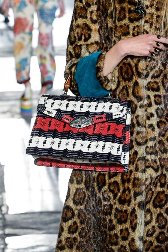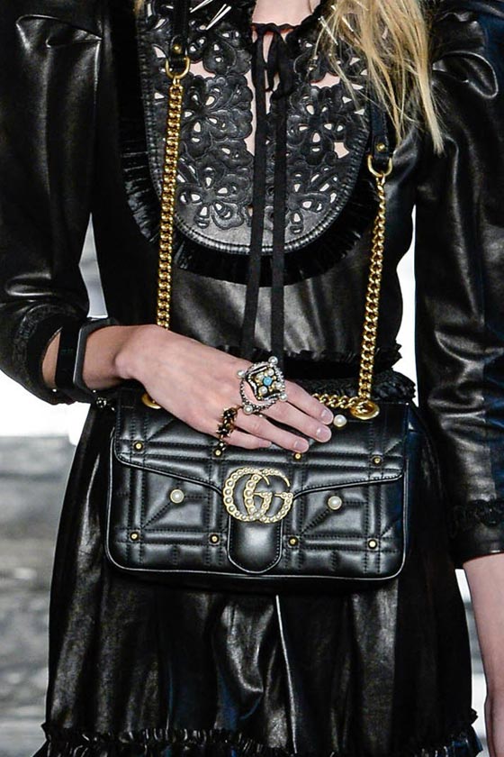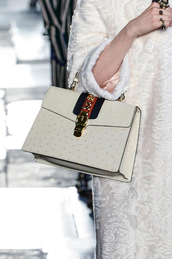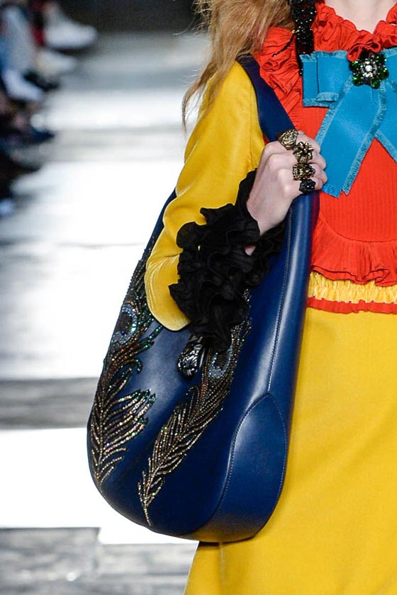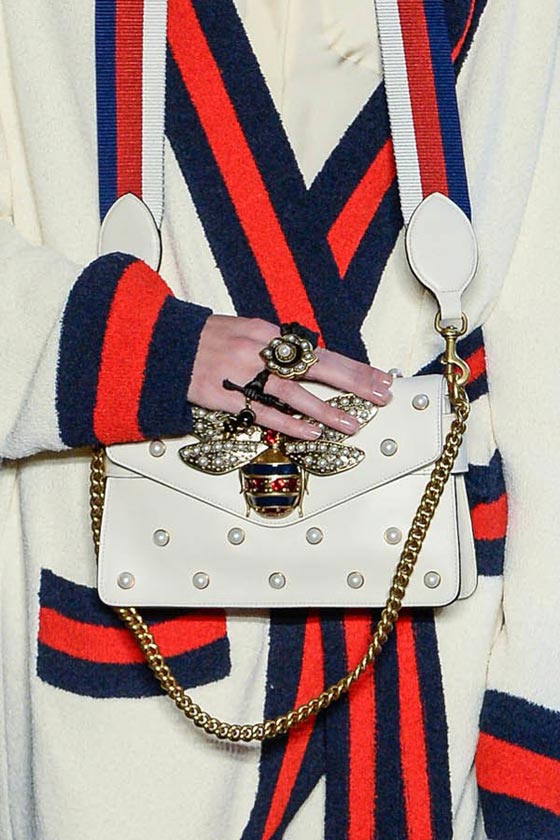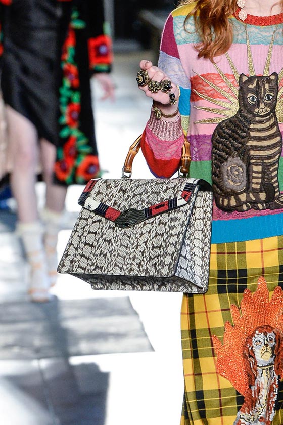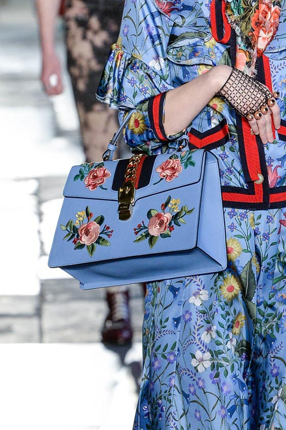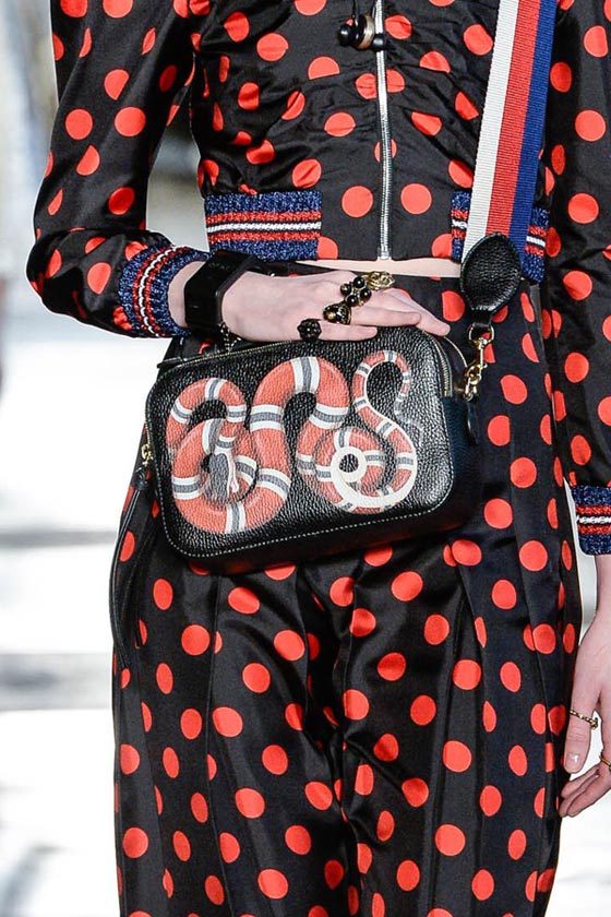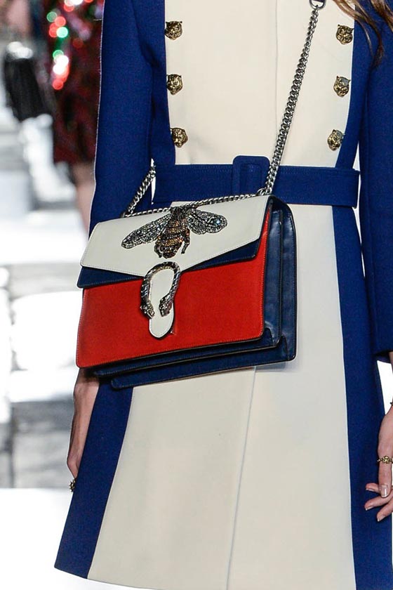 ضمن عرضها الأنيق بلندن قدمت دار غوتشي Gucci تشكيلة فاخرة من شنط اليد، والتي تكونت من باقة مميزة من شنط الكتف على إختلاف موديلاتها وأحجامها. ففي مجموعة ريزورت 2017 ركزت الدار الإيطالية على حقيبتها الأيقونية Dionysus بتصميمها الفاخر والعملي، والتي تميزت هذا الموسم بالتطريزات والنقشات الناعمة التي زينتها.