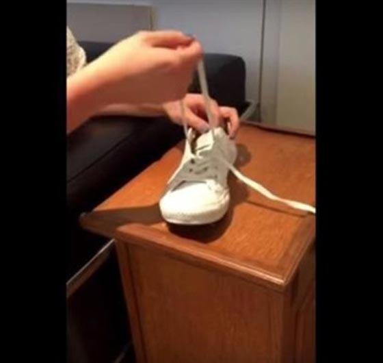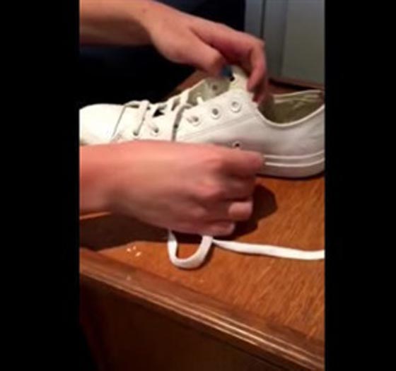 تقوم بسحب الأربطة عبر أول ثقب بالقرب من أصابع القدم، ثم تمرر للثقب الآخر من الخارج، ثم يتم سحب وإرجاعها للثقوب العلوية من الداخل لربط الحذاء.