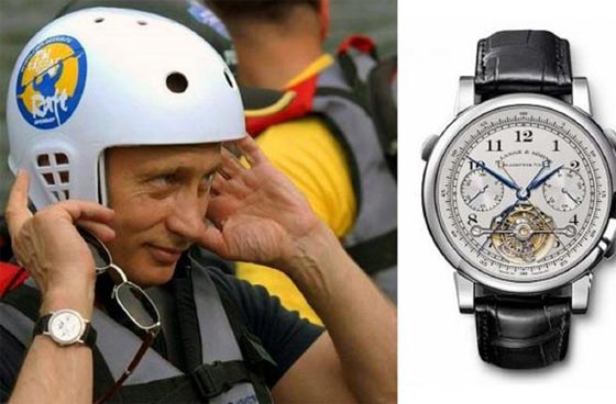 الرئيس الروسي فلاديمير بوتين يرتدي ساعة لانجي اند زونَ تيربوغراف النادرة. يبلغ سعرها 533400 دولار.