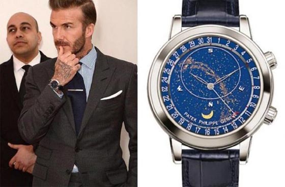 النجم الانجليزي ديفيد بيكام يرتدي ساعة باتِك فيليب سيليستيال. يبلغ سعرها ما يقارب 266700 دولار.