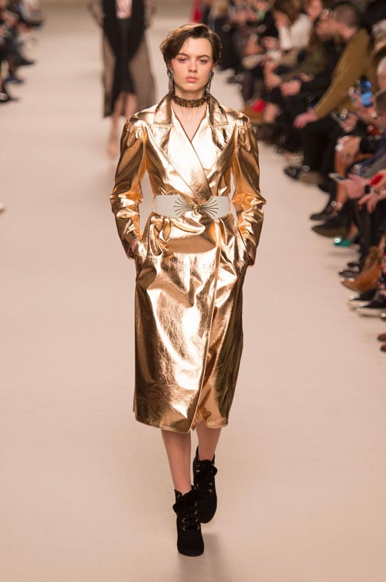 1- الذهبي: هو لون غنيّ ودافئ خرج من عالم الكوتور هذا الخريف ليدخل مجال الأزياء الجاهزة. وقد رصدناه في العديد من العروض، لفتنا منها اتخاذه شكل معطف لدى Lanvin واختلاطه مع الأسود لدى Chanel وGucci.