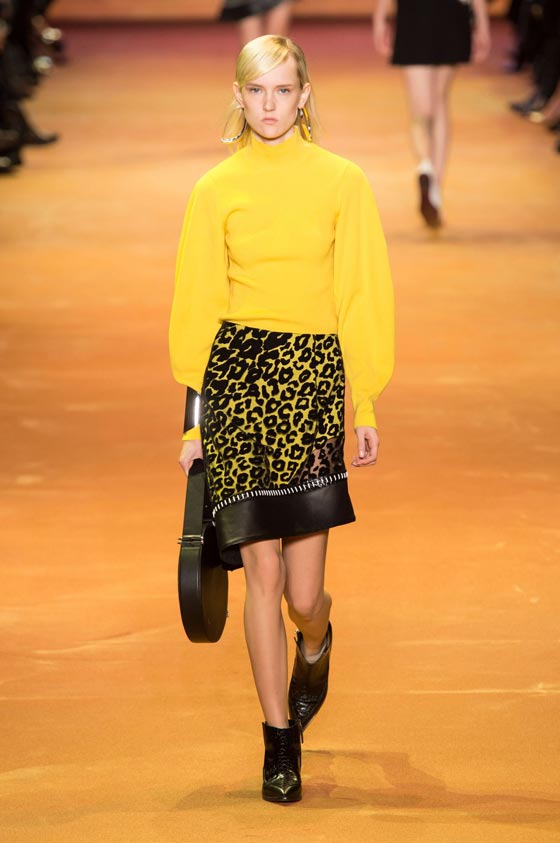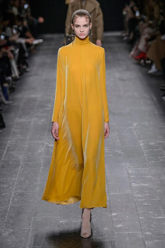 10- الأصفر الخردلي: اعتمدت دار Valentino هذا اللون في عرضها الخريفي، حيث اتخذ شكل أثواب من المخمل. وقد رصدناه أيضاً لدى كل من Chloe وLouis Vuitton حيث اختلط بأناقة الأسود.