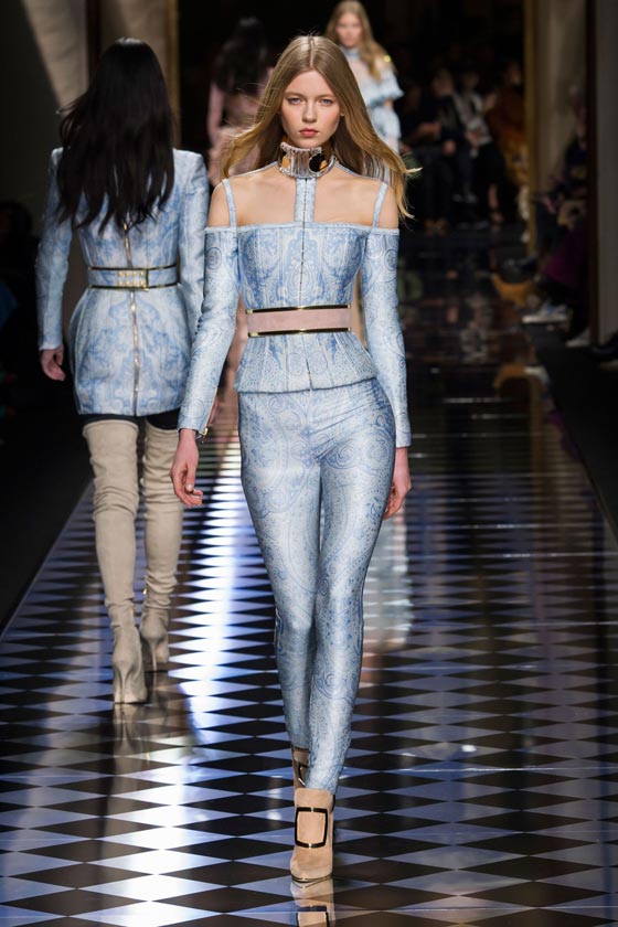 2- الأزرق السماوي: ليس لوناً شتوياً ولكنه استُعمل ليلوّن الإطلالات بالكامل في بعض العروض منها لدى Balmain وDolce&Gabbana.