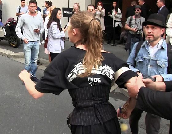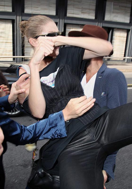 أثبتت عارضة الأزياء العالمية ذات الأصول الفلسطينية رائعة الجمال جيجي حديد أنها ليست فقط غاية في الأناقة والنعومة، بل إنها يمكن أن تتحول في لحظة - إذا ما تناولتها أو عرضت لها يد غريبة - إلى وحش كاسر يدفع ويضرب بكل عنف وقوة. ووقعت الحادثة الخميس، عقب مشاركة جيجي حديد في عرض ماكس مارا للموضة بمدينة ميلان الإيطالية.