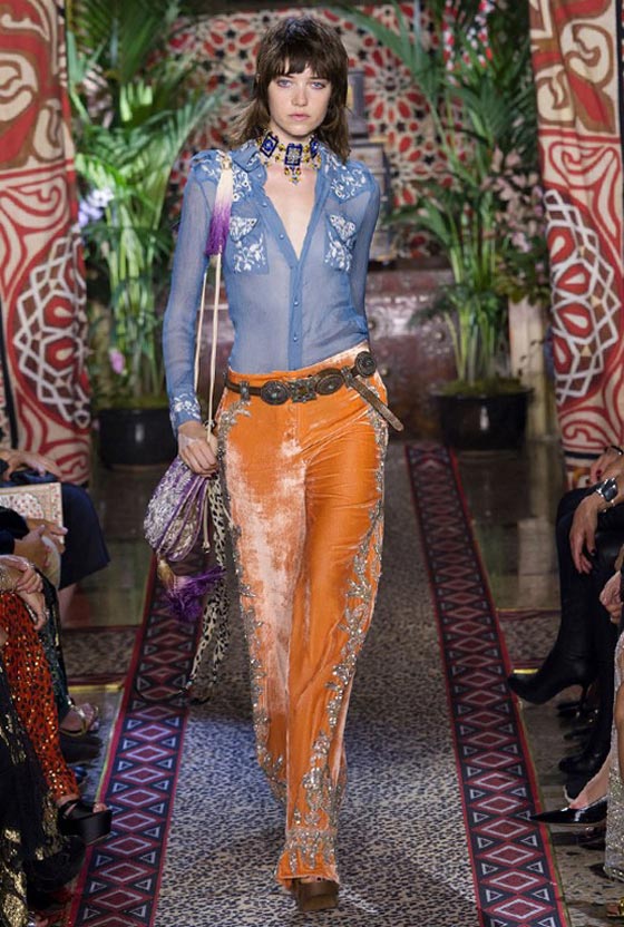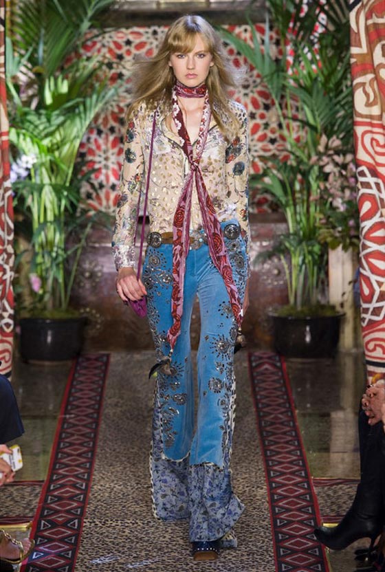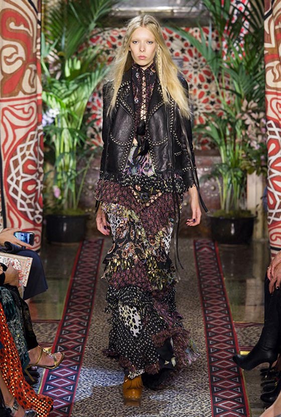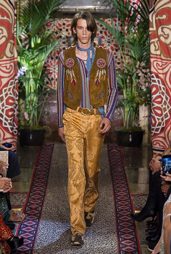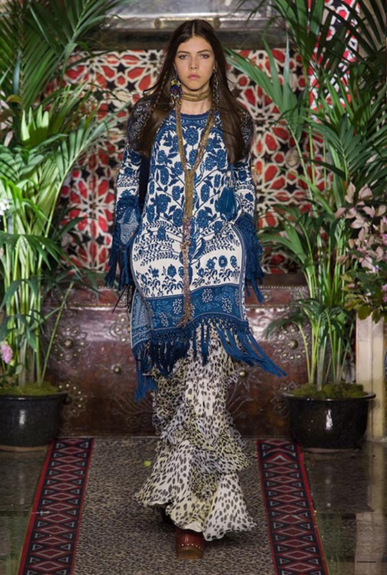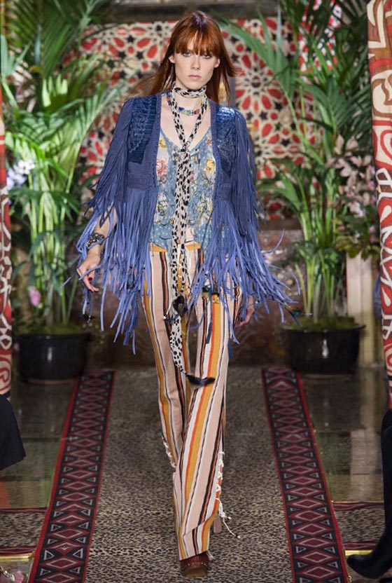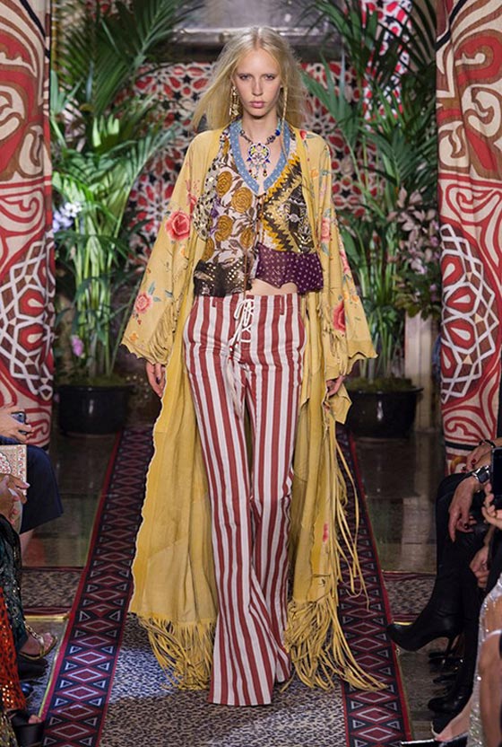 فقد تمّ الجمع بين بنطلونات الدنيم المطبّعة، والقمصان المخطّطة، والجاكيتات المطرّزة، والشالات المزيّنة بالشراريب... في إطلالات بدت متكلّفة لشدّة ابتعادها عن البساطة.البنطلونات ذات الخصور المنخفضة والأقدام الواسعة تزيّنت بالرقع، والتطريزات، والقطع الجلدية، وتناسقت مع جاكيتات "بلايزر" ضيّقة أو قمصان مطبّعة. أما الأثواب البوهيمية الطويلة فتميّزت بقماشها المنسدل الذي جاء مطبّعاً في معظم الأحيان. النقشات الحيوانية الغالية على قلب دار Cavalli تكرّر ظهورها في أكثر من إطلالة. وقد تمّ تنسيقها مع الأقمشة المطبّعة أو المخطّطة في تركيبات غير متوقعة. أما "البانشو" المزيّن بالشراريب و"الكيمونو" المطبّع والمطرّز فمن القطع التي اعتمدت في الإطلالات النسائية والرجالية على السواء.