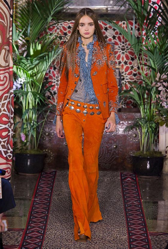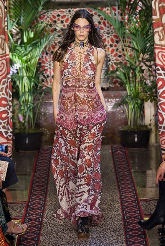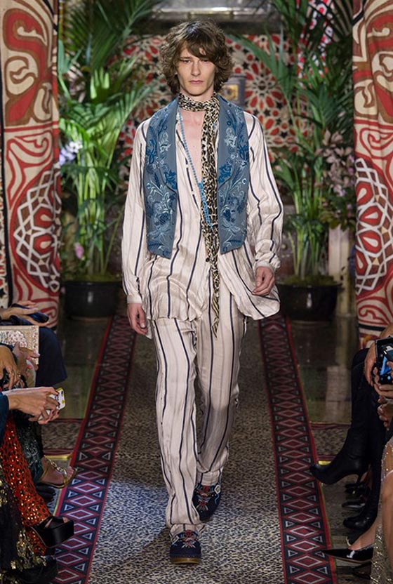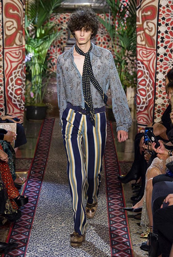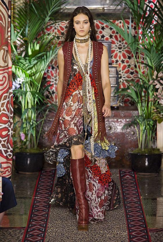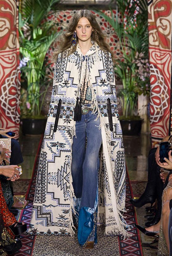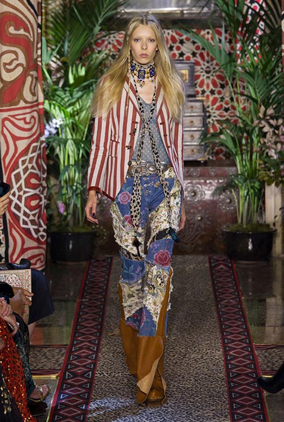 فقد تمّ الجمع بين بنطلونات الدنيم المطبّعة، والقمصان المخطّطة، والجاكيتات المطرّزة، والشالات المزيّنة بالشراريب... في إطلالات بدت متكلّفة لشدّة ابتعادها عن البساطة.البنطلونات ذات الخصور المنخفضة والأقدام الواسعة تزيّنت بالرقع، والتطريزات، والقطع الجلدية، وتناسقت مع جاكيتات "بلايزر" ضيّقة أو قمصان مطبّعة. أما الأثواب البوهيمية الطويلة فتميّزت بقماشها المنسدل الذي جاء مطبّعاً في معظم الأحيان. النقشات الحيوانية الغالية على قلب دار Cavalli تكرّر ظهورها في أكثر من إطلالة. وقد تمّ تنسيقها مع الأقمشة المطبّعة أو المخطّطة في تركيبات غير متوقعة. أما "البانشو" المزيّن بالشراريب و"الكيمونو" المطبّع والمطرّز فمن القطع التي اعتمدت في الإطلالات النسائية والرجالية على السواء.