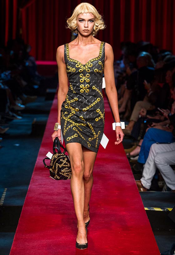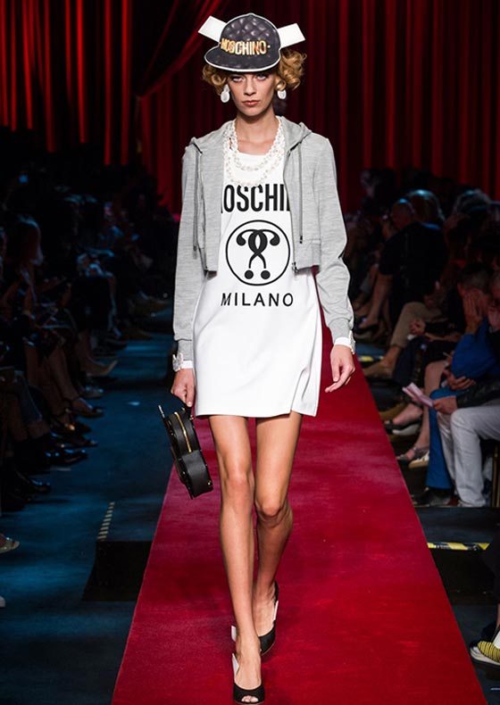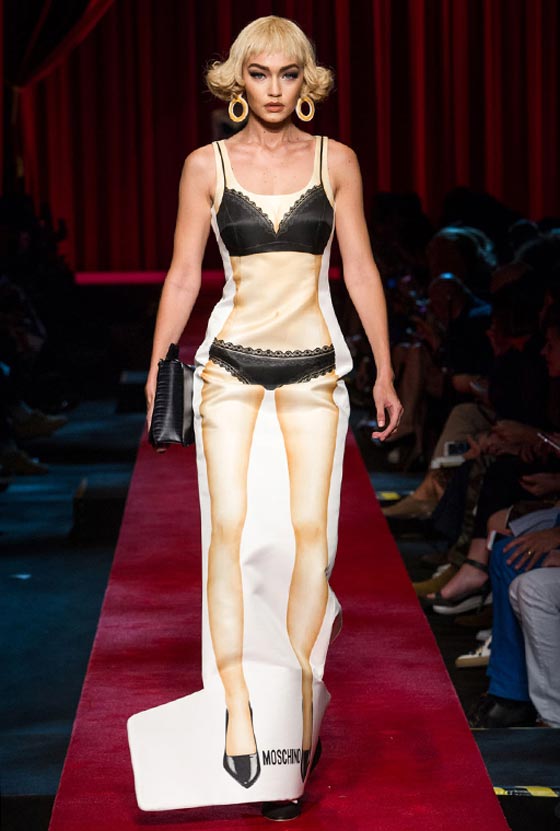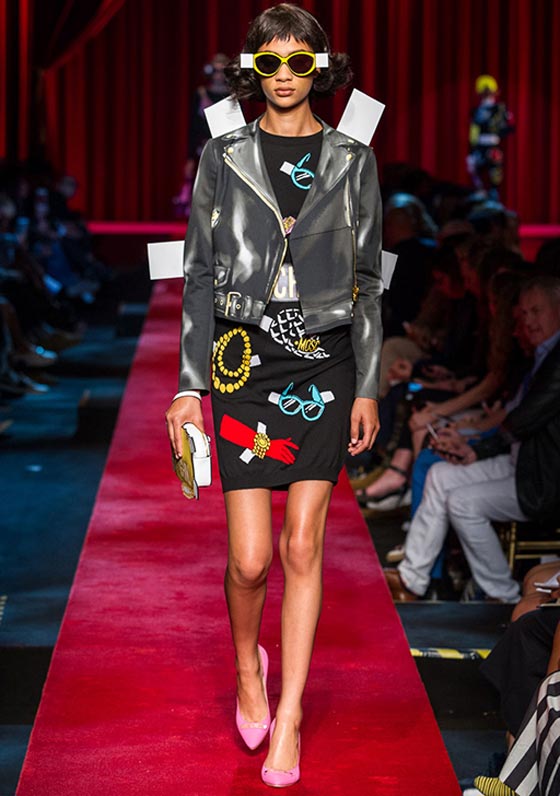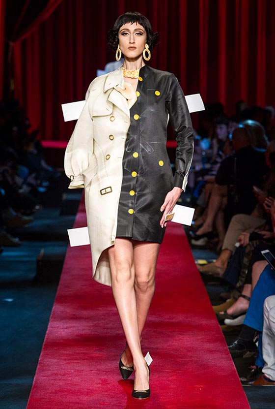 تضمّن العرض 60 إطلالة تميّزت بأفكارها المبتكرة التي تمّ تنفيذها بدقّة كبيرة، وحرفيّة عالية من خلال تقنيّة الرسم المعروفة بأسلوب Trompe L’oeil الذي استعمل تقريباً على جميع الإطلالات. وقد أضيفت إلى الأزياء شرائط بيضاء، تستخدم عادة تثبيت أزياء الدمى الورقية، كتفصيل يضفي لمسة من إضافية من المرح على الإطلالات. أتقن سكوت لعبة الظلّ والنور، وتلاعب بدرجات الألوان لمنح الأقمشة الطابع المسطّح فبدت الأزياء كأنها لوحات متصلّبة غطّت أجسام العارضات. وقد قام ببراعة برسم أجزاء من الجسم على الأزياء، ليجد الناظر إليها صعوبة في التفريق بين الجزء الحقيقي والجزء المرسوم من الجسم.رموز Moschino الأيقونية ومنها السلاسل، وعلامة السلام، والدببة، ولوغو العلامة تمّ رسمها بأسلوب Trompe L’oeil على الأزياء.