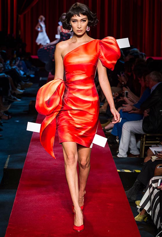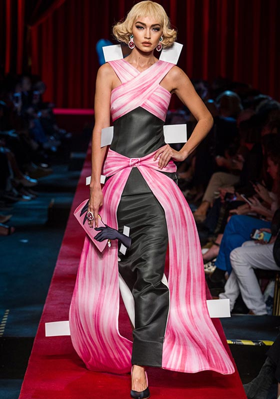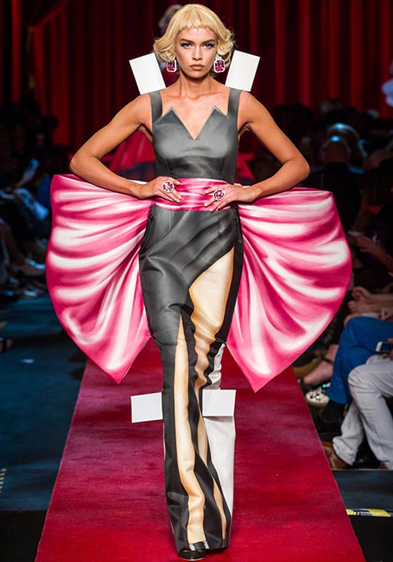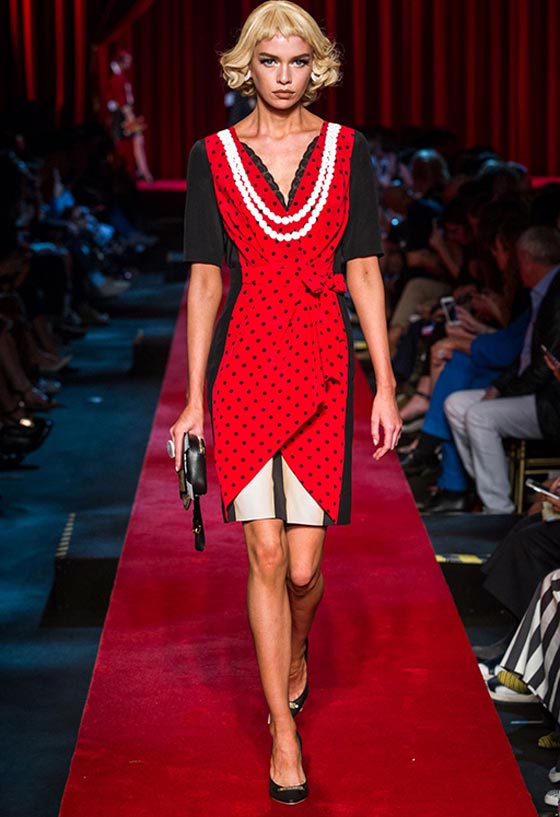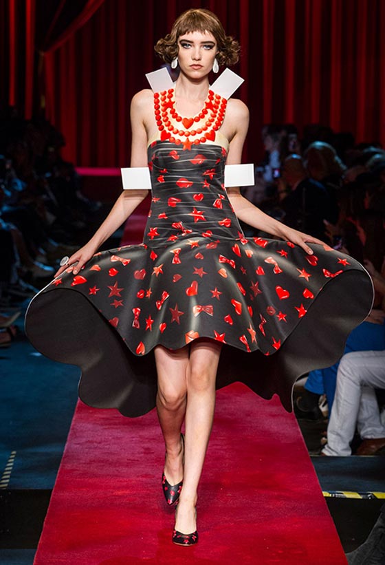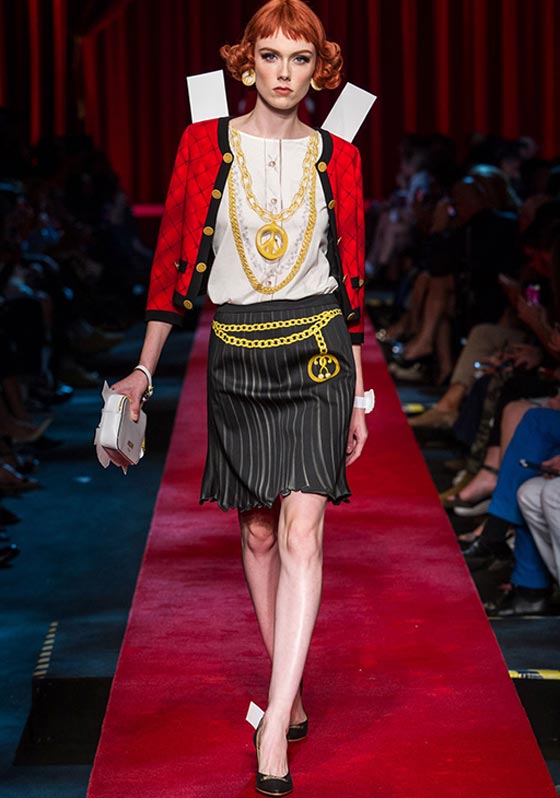 يبدو أن جيريمي سكوت، المدير الإبداعي في دار "موسكينو"، أراد هذا الموسم أن يصمم أزياء للدمى الكرتونية. ولكنه حرص على أن تكون بأحجام حقيقية لتستفيد منها "الفاشينيستاز" اللواتي ينتظرن تصاميمه كل موسم بفارغ الصبر، ليكتشفن أي فكرة غريبة سيحوّلها إلى أزياء لا تخلو أبداً من حسّ الفكاهة والمرح. وفي عصر المجسّمات الثلاثية الأبعاد، عمل سكوت على ترجمة حنينه إلى الماضي عبر تقديم أزياء تتميّز بكونها ثنائية الأبعاد، تبدو كما لو أنها رسومات مسطّحة يتم تعليقها على الدمى الكرتونية التي شكّلت اللعبة المفضّلة لدى الفتيات الصغيرات في الفترة الممتدة بين سبعينيات وتسعينيات القرن الماضي.