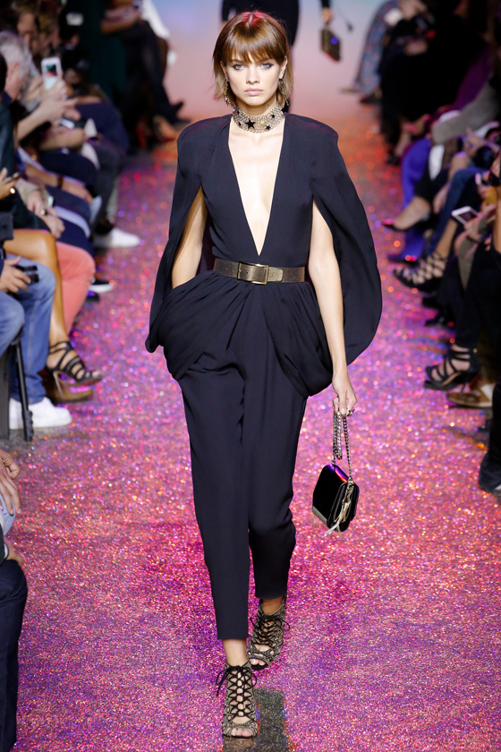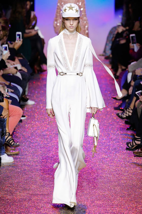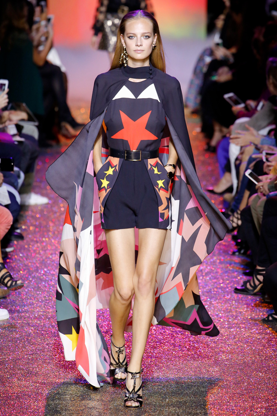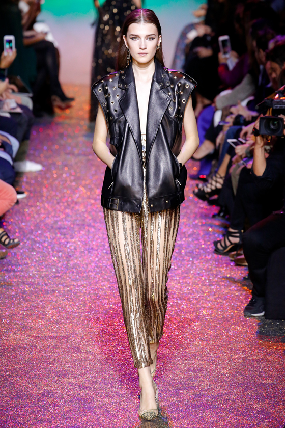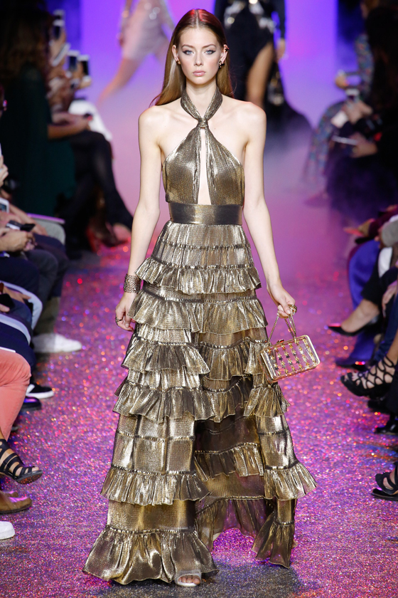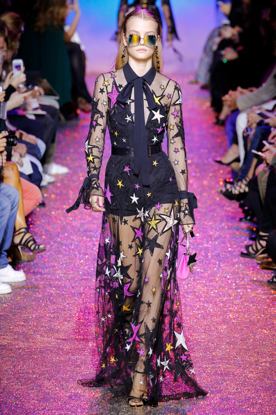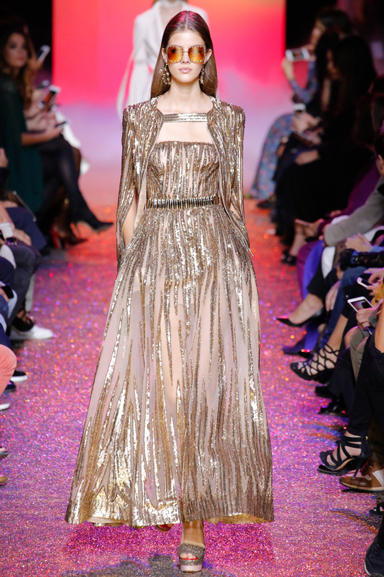 إنّه عرض أزياء إيلي صعب الذي ننتظره من موسمٍ إلى آخر ولا نفرّق ما إذا كان موسم الأزياء الراقية أو الجاهزة حيث أنّنا ندرك أنّ هذا المصمّم اللبناني العالمي لا يمكن إلا أن يقدّم الأجمل والتصاميم الأكثر أناقة مهما كان الموسم وسواء كانت المجموعة للأزياء الجاهزة أو الراقية. بدأ العرض مع موسيقى صاخبة وحيويّة أعادت الحضور إلى أيام الديسكو إلى حين بدأت تظهر عارضات الأزياء متألقات بأزياء من الترتر أي الباييت والقماش المطبّع بالنجوم والشراريب المزيّنة بدورها، حتى بدا أنّ إيلي صعب اختار فعلاً أن يعيد الحضور إلى زمن الديسكو وأيام السبعينيات ويقدّم مجموعة مستوحاة من الديسكو.