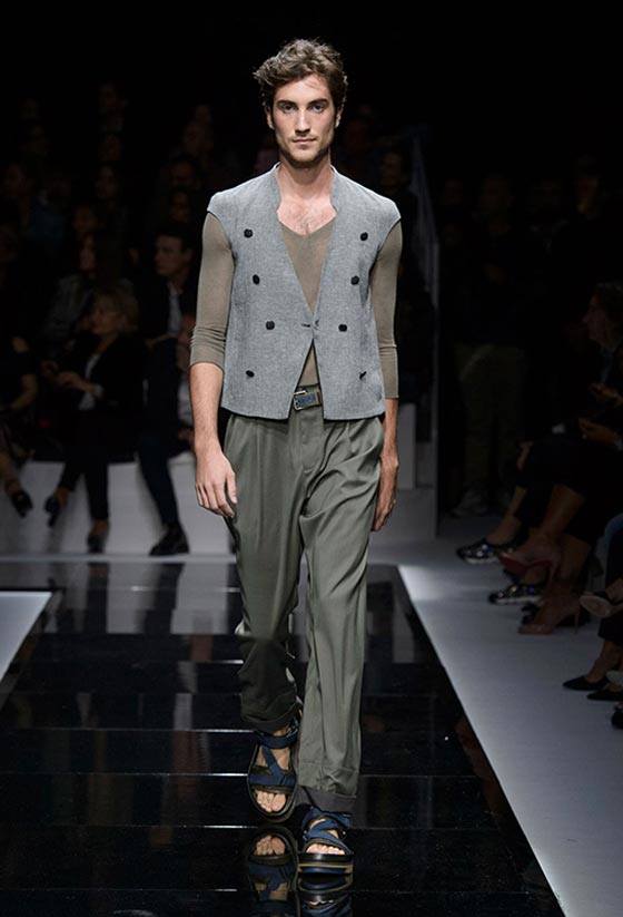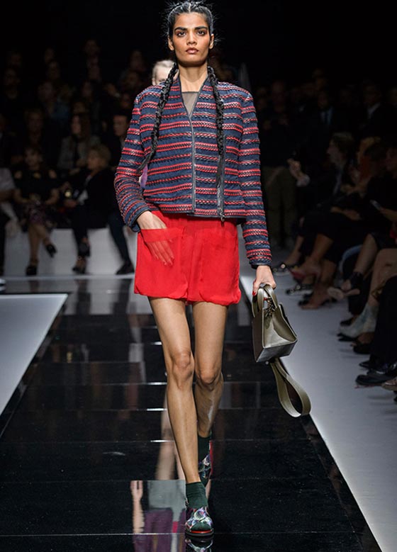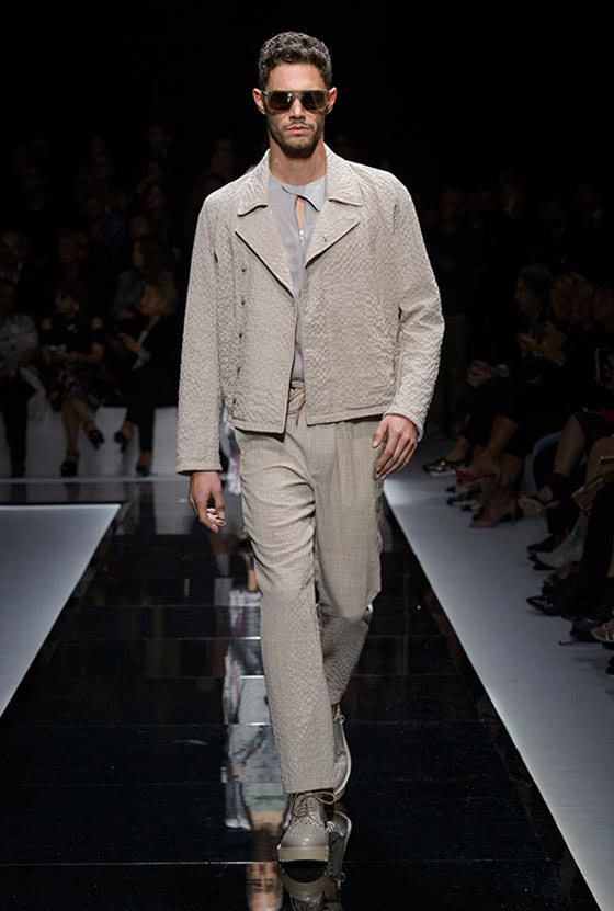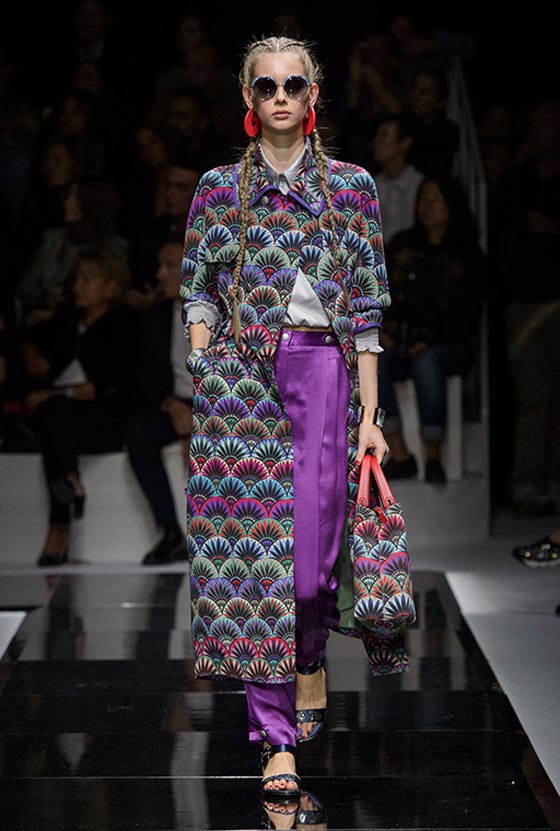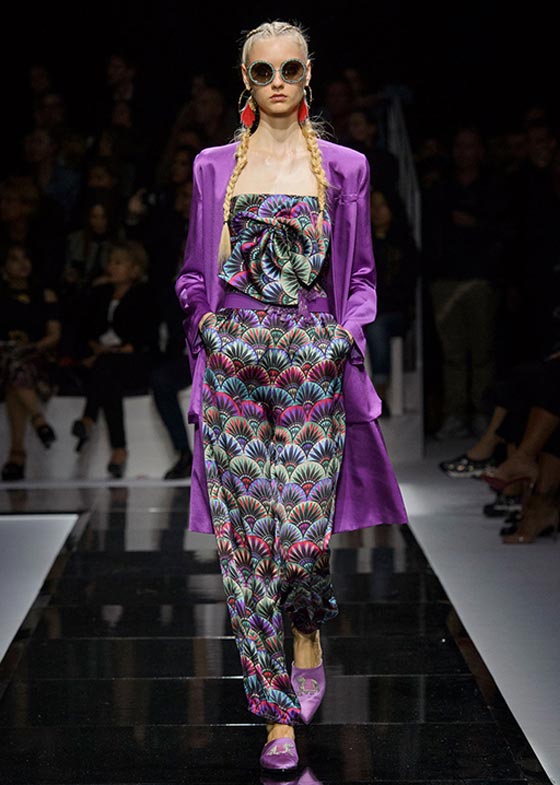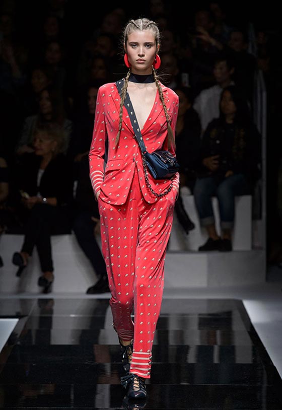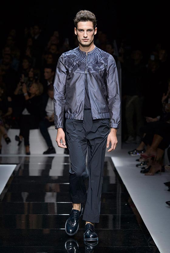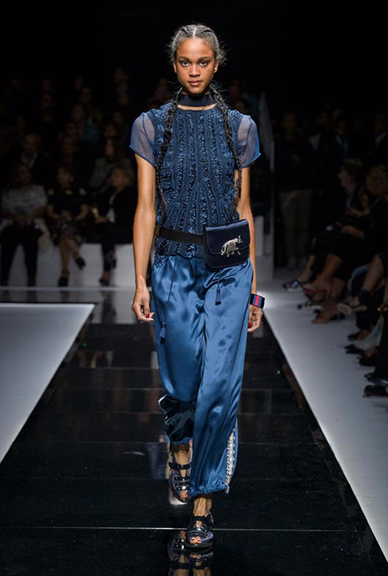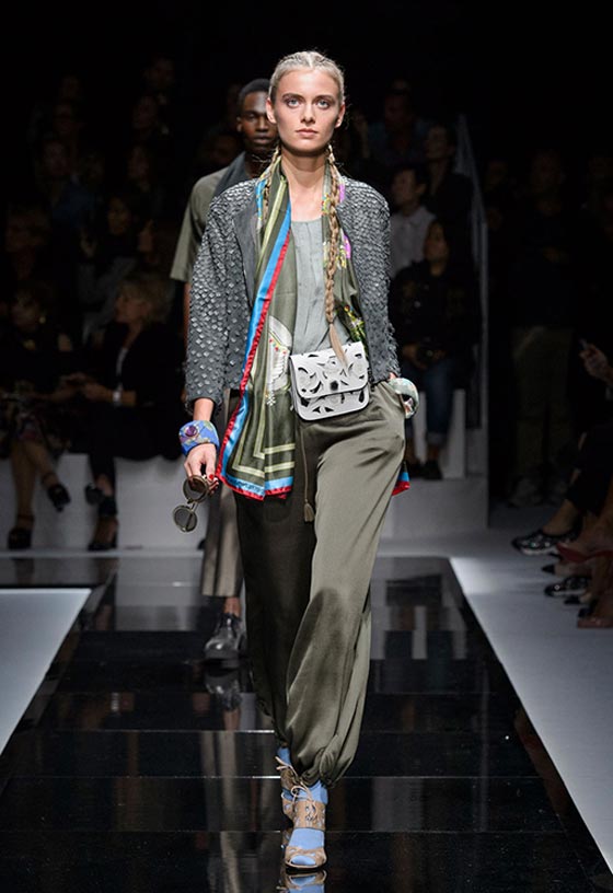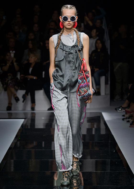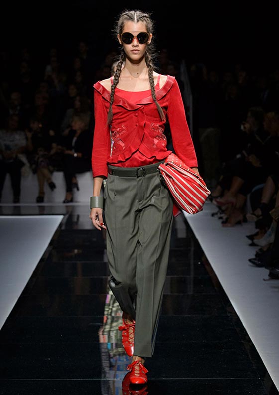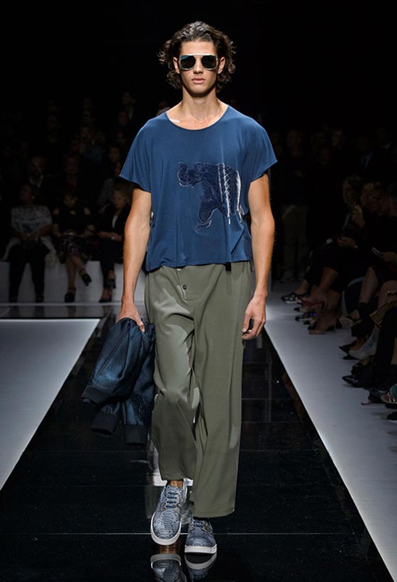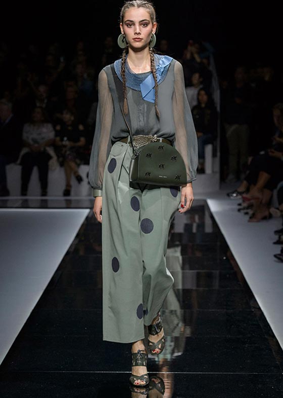 البنطلون الواسع من القطع التي تكرّر ظهورها في هذه المجموعة، وقد تمّ تنفيذه بقصّات رجالية حتى في الإطلالات النسائية. أما الأثواب الحريرية فتميّزت بطابعها العملي الذي لا يخلو من الأناقة فيما تمّ تنفيذ سترات "البايكر" بالجلد حيناً وبقماش الحرير حيناً آخر وتزيّنت بالتطريزات الأنثوية الناعمة.الإطلالات الرجالية التي تضمّنها العرض بدت كأنها مأخوذة من عرض الدار المخصص للأزياء الرجالية الذي سبق أن تمّ تقديمه في وقت سابق من هذا العام. وقد بقيّت وفيّة لروحيّة Armani التي تركّز على الطابع العصري الأنيق.