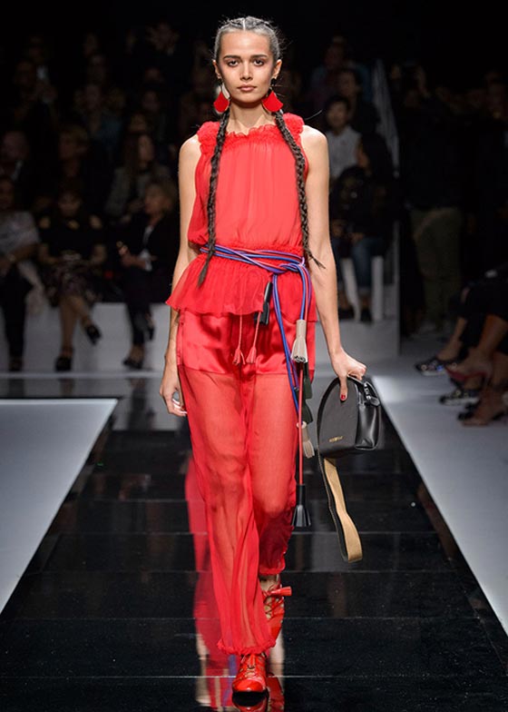 الإكسسوارات التي رافقت الأزياء غلب عليها الطابع الإثني والعملي على السواء، وقد لفتتنا منها الأحذية المسطّحة التي تزيّنها الشرائط والصنادل ذات الكعوب المرتفعة التي تمّ ارتداء بعضها مع جوارب سميكة. أما الحقائب فلفتنا منها تلك المزوّدة بحزام للخصر والتي يزيّنها تصميم فيل معدنيّ. كما لفتتنا تسريحات العارضات التي اعتمدت شكل ضفائر طويلة انطلقت من قمّة الرأس لتصل إلى أسفل الظهر. تعرّفوا على بعض إطلالات Emporio Armani للربيع والصيف المقبلين فيما يلي.