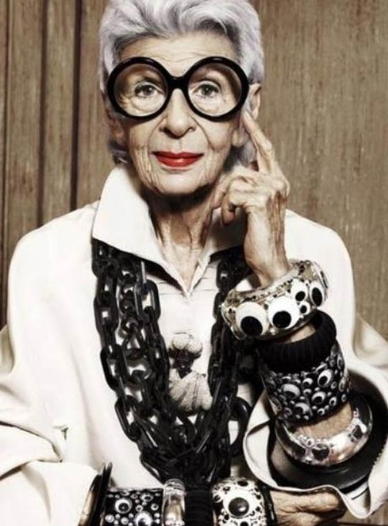تماما كما تظهر بالصورة، لا زالت الموديل الأمريكية "آيريس آبفل" تهتم بالموضة على الرغم من سنها الذي تجاوز الـ95 إذ أنها من مواليد نيو يورك 1921..