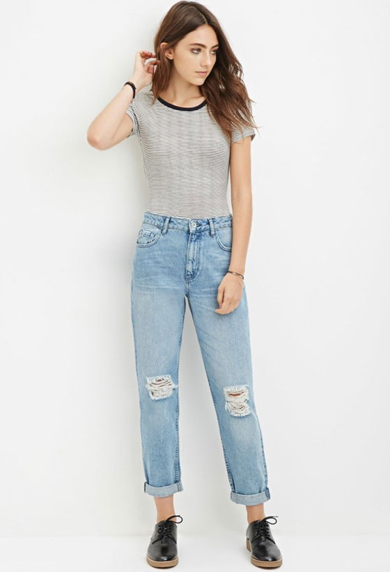 4. الخصر المرتفع: والمفضل للنساء ذوات الخصر القصير أو العريض؛ لكون الخصر عند السرة أو أعلاها مباشرة، فهو يخلق مساحة أطول لمنطقة الخصر، ولكن قد تواجهك صعوبة في الحصول على هذا البنطلون فليس على آخر صيحة في الدينم.