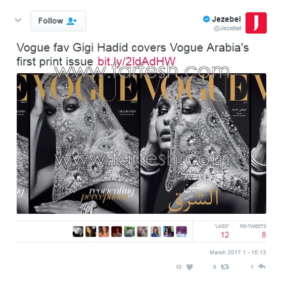 حظيت عارضة الأزياء الأميركية من أصول فلسطينية، جيجي حديد، بفرصة لتكون أول نجمة تظهر على غلاف مجلة الأزياء الشهيرة "فوغ" في نسختها العربية في أول إصدار لها بمنطقة الشرق الأوسط. وستظهر جيجي حديد بالحجاب مرتدية غطاء للرأس في صورتين مختلفتين للصفحة الأولى لمجلة "فوغ" العربية تحت عنوان "عين على الشرق"، واصفة هذه التجربة بأنها "تعني الكثير" بالنسبة إليها.