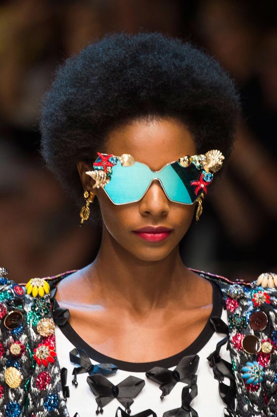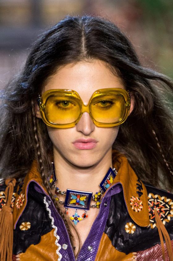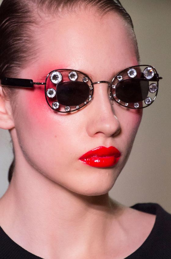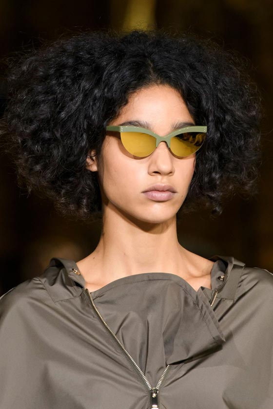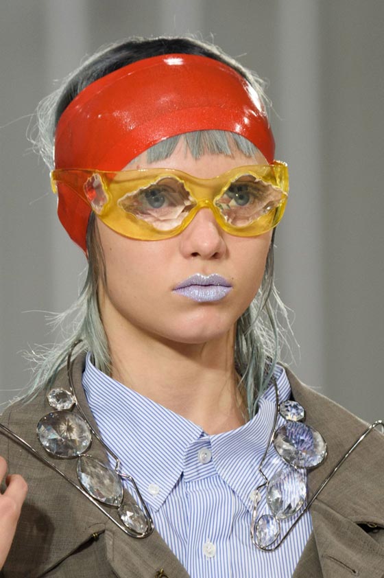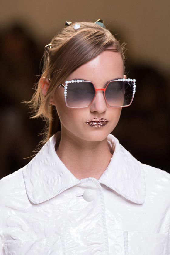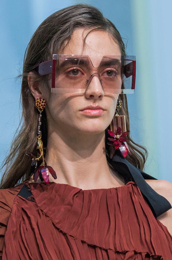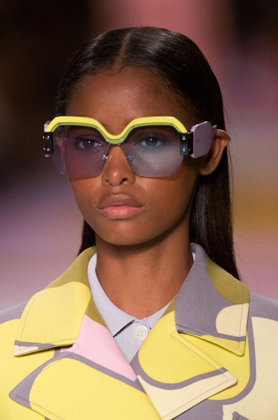 النظارات التي تتخذ شكل قناع تجلّت بكلّ غرابتها في عرض Marni، حيث ظهرت باللون البني الشفّاف وفي عرض Maison Margiela حيث تلوّنت بالأصفر. وقد ظهرت النظارات التي تزيّنت بالأصفر أيضاً في كلّ من عروض Roberto Cavalli وMiu Miu. اختارت دار Dolce&Gabbana أن ترصّع نظاراتها الشمسيّة بالأصداف، واللآلئ، ونجمات البحر وقد استعانت Fendi بحبّات اللؤلؤ أيضاً لتحديد إطارات نظاراتها.