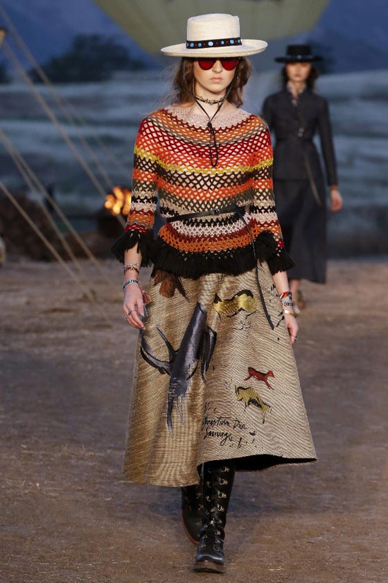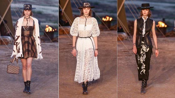 اللمسات الطبيعية التي خيّمت على الأجواء، لم تستطع أن تلغي الطابع الأنثوي الطاغي على الإطلالات والذي جاء فطرياً. وتُرجم من خلال الأثواب التي تصل إلى مستوى الكاحل وتتزين بقصّات مربعة عند الصدر، بالإضافة إلى الخامات الشفافة التي تغلّفت بالتطريز والرسومات البدائية. وتماشياً مع أجواء الغرب الأميركي، تزيّنت الأزياء بالشراريب، واللمسات الجلدية كما ترافقت مع أحذية عالية الساق، بالإضافة إلى قبعات رعاة البقر التي اعتمرتها جميع العارضات. تعرّفوا على بعض أجمل إطلالات مجموعة Dior Cruise2018 فيما يلي.