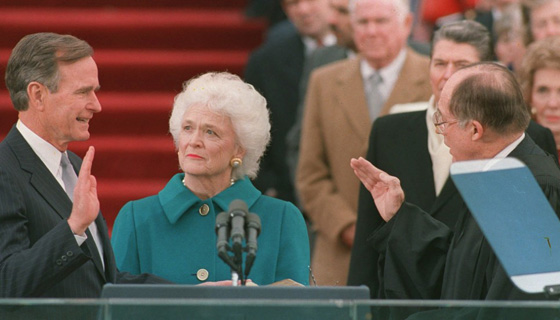 1. باربرا بوش: عام 1989، ارتدت السيدة الأولى للولايات المتحدة، باربرا بوش، زوجة الرئيس الأسبق جورج بوش، في حفل تنصيبه، معطف أزرق اللون، وعقد مصنوع من اللؤلؤ وأقراط ذهبية يتوسطها حبة من اللؤلؤ.