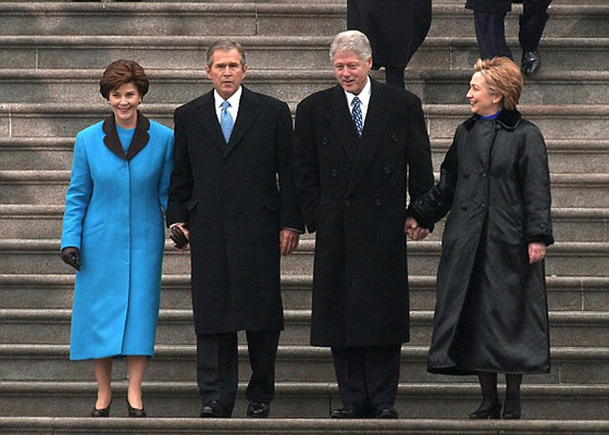 2. لورا بوش: ارتدت زوجة الرئيس الأمريكي السابق جورج بوش الابن، في حفل التنصيب معطفا طويلا، أزرق اللون وقفازات جلدية سوداء.