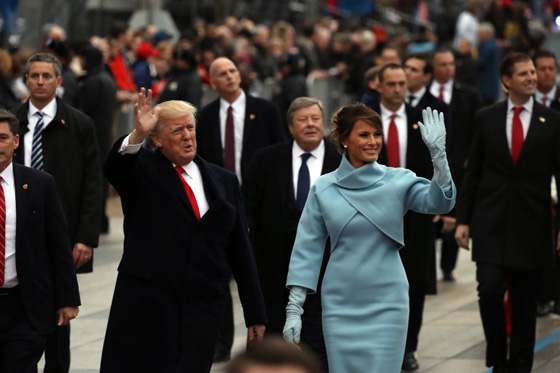 3. ميلانيا ترامب: اختارت ميلانيا ترامب اللون، الظهور بفستان أزرق فاتح محتشم، ومعطف أنيق، من تصميم العالمي رالف لورين، في حفل تنصيب رئيس الولايات المتحدة الأمريكية، دونالد ترامب.
