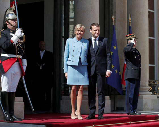 4. بريجيت ماكرون: ارتدت بريجيت، زوجة الرئيس الفرنسي، إيمانويل ماكرون، خلال حفل تنصيب زوجها، أمس الأحد، بذلة من قطعتين لونها أزرق، من دار أزياء لوي فيتون.