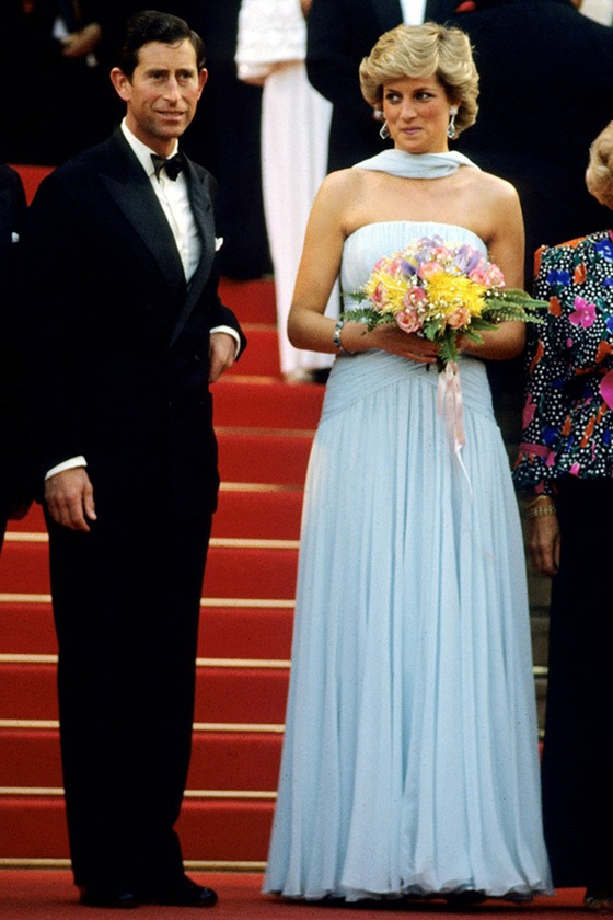 2. الأمير تشارلز والأميرة ديانا في العام 1987: ويُقال إن الأمير تشارلز زف خبر وفاة عشيق الأميرة ديانا، باري ماناكي، إليها وهما في سيارة الليموزين بطريقهما إلى مهرجان كان السينمائي في العام 1987، حين أطلت ديانا بفستانها الشيفون الأزرق الأيقوني من تصميم كاثرين ووكر.