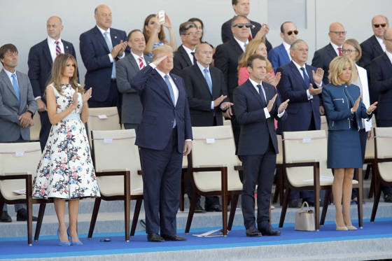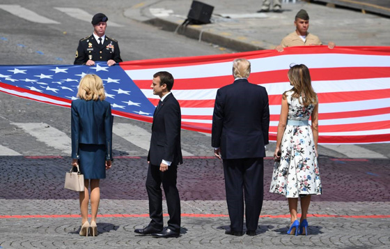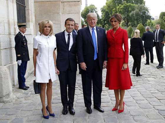 وفي إطلالة ميلانيا الثالثة خلال العرض العسكري الذي جرى بمناسبة احتفالات العيد الوطني الفرنسي، اعتمدت سيدة أميركا الأولى ثوباً أبيض مطبّعاً بالأزهار حمل توقيع دار Valentino نسّقته مع حزام وحذاء باللون الأزرق. أما بريجيت فاختارت ثوباً وسترة باللون الكحلي من Louis Vuitton يشبهان إلى حدّ ما إطلالتها البيضاء في استقبال ميلانيا. وقد نسّقت أزياءها مع حذاء باللون البيج وحقيبة من دار Vuitton أيضاً.ورغم كون إطلالات بريجيت ماكرون العصرية تستحوذ على إعجاب العديد من متابعيها ونقّاد الموضة، إلا أنها لم تستطع أن تنافس أنوثة وأناقة السيدة الأميركية الأولى التي اكتسبت بفضل عملها السابق في مجال عرض الأزياء قدرة على اختيار الزي المناسب لإطلالتها وللمناسبات التي ترتادها، فهل توافقونا الرأي؟