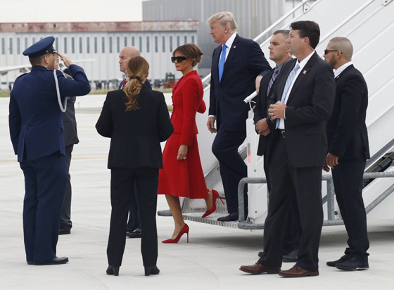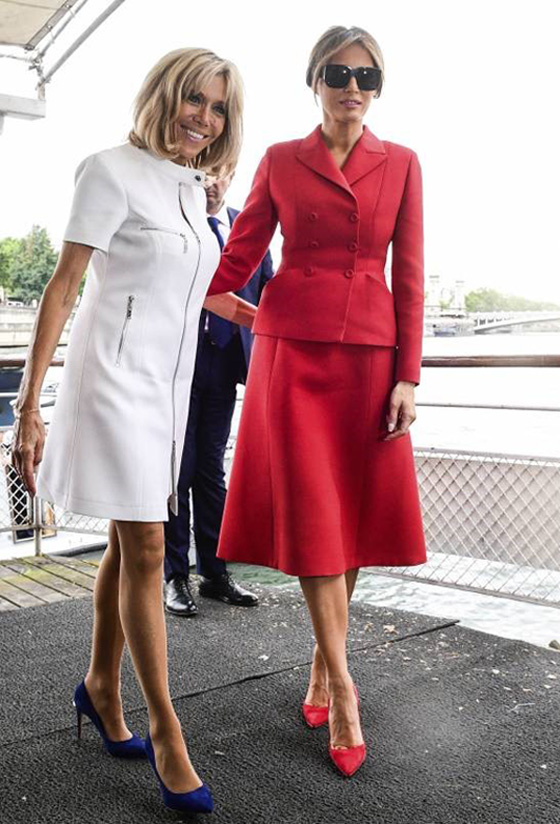 خلال الزيارة الرسمية التي قام بها الرئيس الأميركي دونالد ترامب وزوجته ميلانيا إلى باريس، كانت الأنظار موجّهة إلى سيدتي أميركا وفرنسا لمتابعة إطلالاتهما، وكان السؤال الذي يطرح نفسه في هذا المجال: من كانت الأكثر أناقة؟ وأرادت السيدة الأميركية الأولى ميلانيا ترامب لدى وصولها إلى باريس أن توجّه تحيةً إلى الأناقة الفرنسية عبر ارتدائها تايور باللون الأحمر الفاتح حمل توقيع دار Dior التي تحتفل هذا العام بالعيد الـ70 على تأسيسها. وقد نسّقت إطلالتها مع حذاء أحمر، فيما رفعت شعرها على شكل شينيون، وغطّت عينيها بنظارات سوداء.