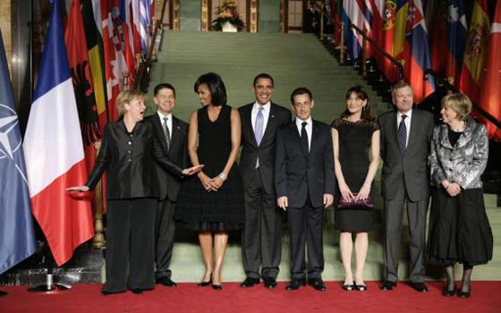 صورة لأنجيلا ميركل عام 2009 مع عائلة الرئيس الأميركي باراك أوباما، وعائلة الرئيس الفرنسي السابق ساركوزي، والسكرتير العام لحلف الناتو جاب دي هوب وزوجته. وجميعهم يرتدون اللون الأسود.