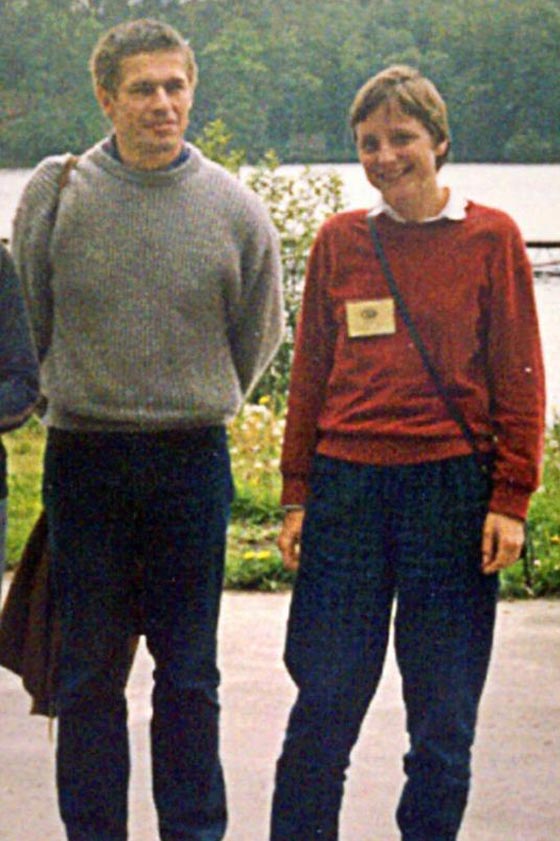 صورة قديمة لأنجيلا ميركل وزوجها يواخيم زاور أثناء وجودهما بمدرسة صيفية بالجامعة لطلبة الكيمياء عام 1989. وتظهر في تلك الصورة أنجيلا ببنطالها الذي كانت ترتديه معظم الوقت.