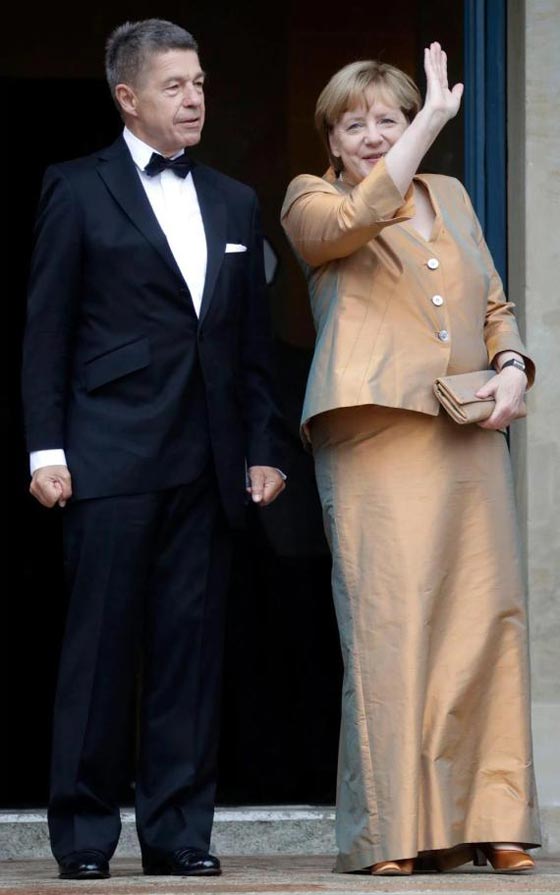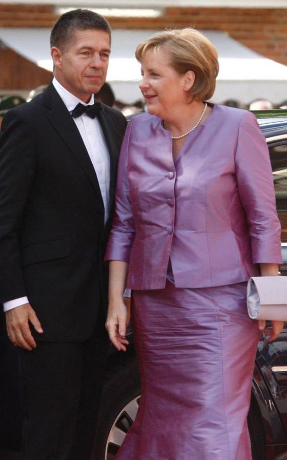 وصول أنجيلا ميركل لافتتاح عرض مهرجان أوبرا فاغنر في مدينة بايرويت الألمانية عام 2005 وهي ترتدي تنورة حريرية قرنفلية اللون شفّافة، وجاكيت من قماش التفتا تأخذ رقبته شكل القلنسوة، مع حذاء وشنطة لهما نفس اللون.