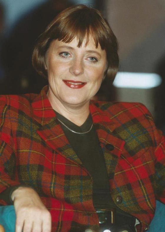 أنجيلا ميركل وهي شابة مرتديةً سترة محبوكة من الصوف، وتنورة من الجينز في أثناء زيارتها لكوخ أحد الصيّادين بمدينة لوب.