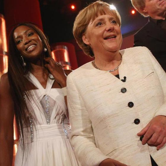 المستشارة أنجيلا ميركل ترتدي سترة أنيقة ذات لونٍ واحد، بحضور عارضة الأزياء الشهيرة نعومي كامبل، أثناء الحفل الخيري لتوزيع جوائز "بيلد" في يونيو/حزيران 2008.