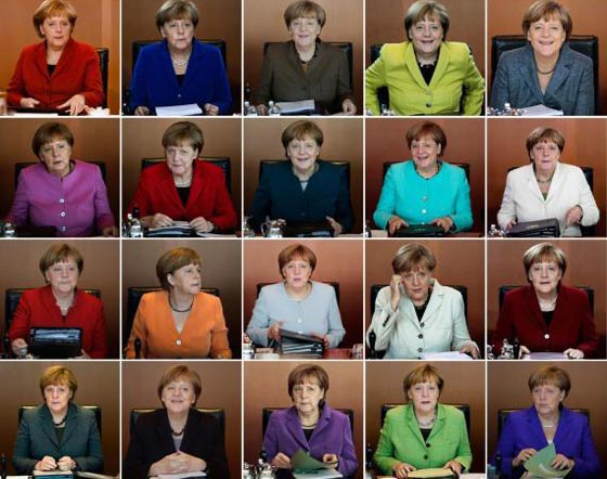 مجموعة صور ملوّنة تُظهِر بعض السترات الملوّنة التي ارتدتها أنجيلا ميركل في اجتماعات مجلس الوزراء، منذ أن جرى انتخابها في عام 2005.
